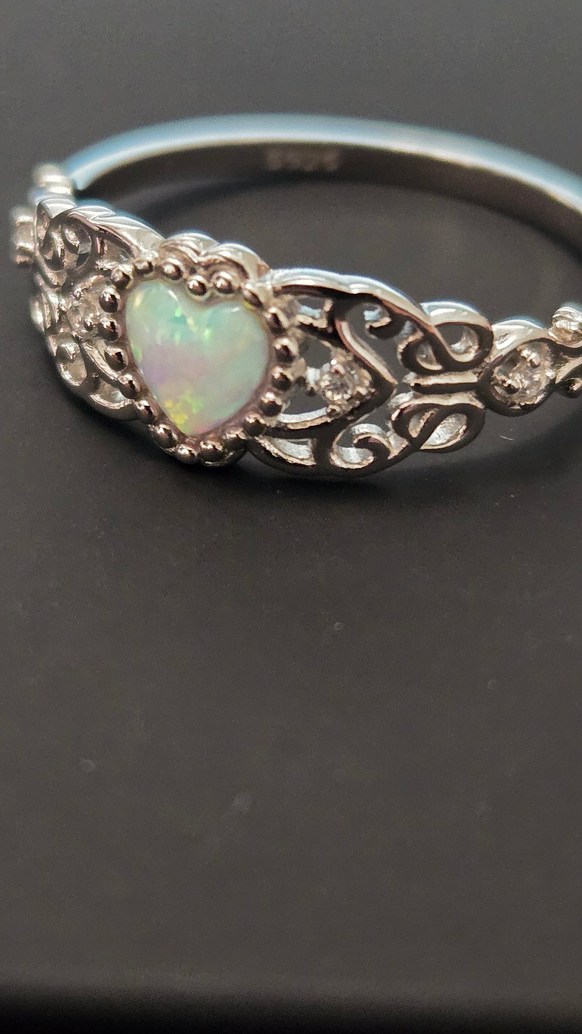 Experience the enchantment of natural opal with this exquisite heart ring—where mystical beauty meets timeless artistry. This isn't just a ring; it's a wearable piece of magic.